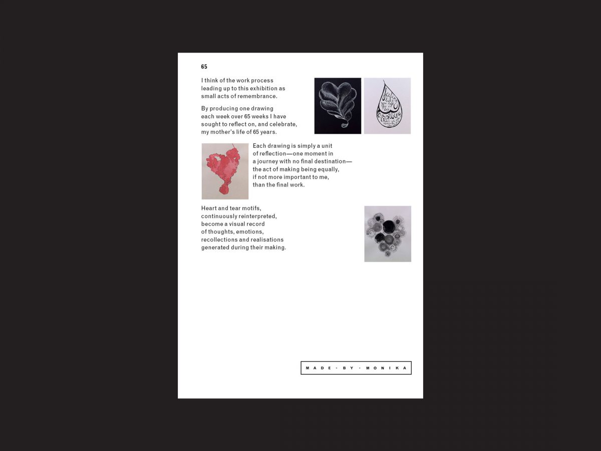 the act of making being equally, if not more important than the final work. I think of the work process leading up to this exhibition as small acts of remembrance. By producing one drawing each week over 65 weeks I have sought to reflect on, and celebrate, my mother’s life of 65 years